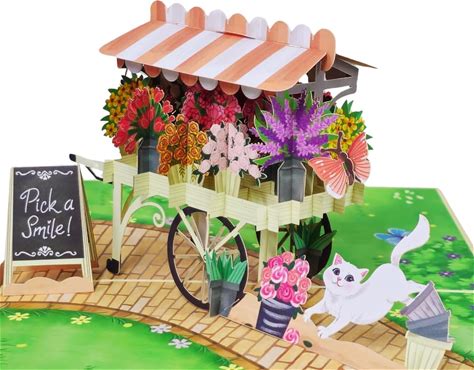 POPWOW Flowers Cart Pop Up Card, Cat Catching Butterfly, 3D Greeting Card, Gifts For Birthday, Mothers Day, Valentines Day, Mom, Wife, Girlfriend,