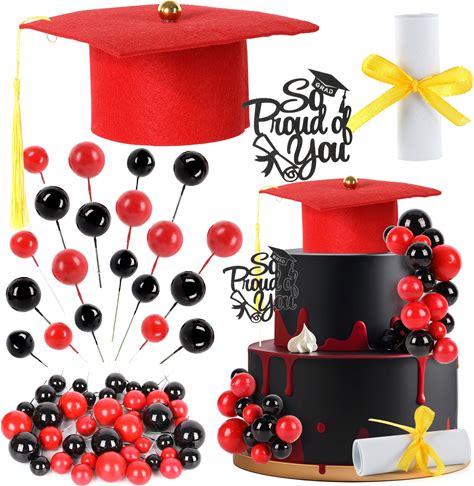 43Pcs Graduation Cake Kit Included Felt Grad Cap With Tassel Red Black Balls Graduations Party Supplies So Proud Of You Cupcake Topper For Congrats