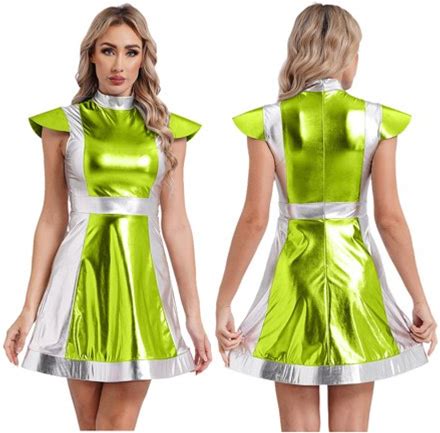 Yizyif Women Space Alien Costume Metallic Dance Dress For Halloween Role Play Robot Astronaut Outfit Green L