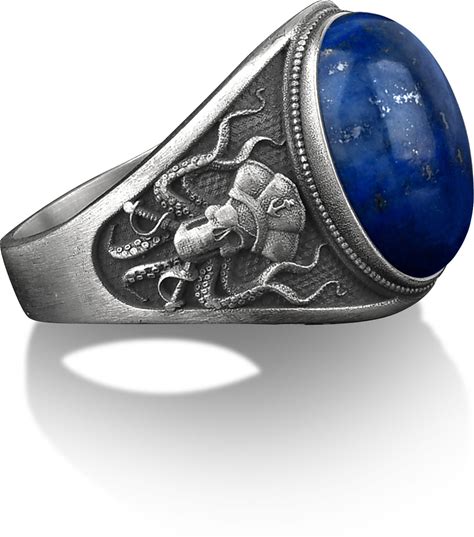 Priate Octopus With Blue Stone Silver Ring For Men, Blue Lapis Lazuli Silver Man Ring, Silver Signet Octopus Pinky Ring, Sailor Octopus Ring