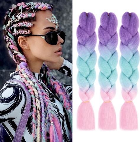 Rainbow Braiding Hair Extensions Colorful Braiding Hair Pre Stretched 24Inch 3Packs Pink Ombre Braiding Hair Purple-Green-Pink